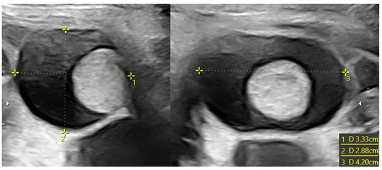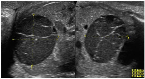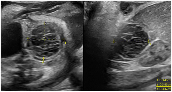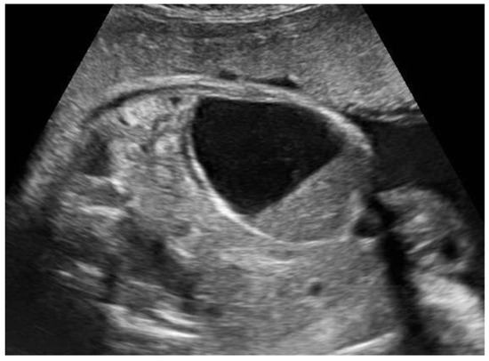 They are usually diagnosed in the third trimester after 28 weeks of gestation [17], as the hypothalamus–hypophysis–ovary axis activates and are typically benign and functional. Their formation can be explained by a stimulation of fetal ovaries by maternal estrogens, fetal gonadotropins, and human chorionic gonadotropin [17,18]. Cysts can reach 10 cm of diameter [17,19,20] and in 5% of cases, they are bilateral. Ovarian cysts are usually located laterally in the lower abdomen, and a very specific sign to ascertain the ovarian origin of the cysts is the “daughter cysts sign”, which consists in detecting a smaller cyst inside the main one [20,21].