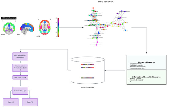Graph-theoretical approaches have been widely applied to fMRI data to construct functional brain networks, where nodes represent regions of interest (ROIs) and edges represent functional connections based on statistical associations [13,14]. These methods enable the quantification of network properties such as efficiency, modularity, and centrality, facilitating the exploration of how brain networks reorganize in PD [15,16]. Studies have reported alterations in network topology in PD patients, including decreased global efficiency, disrupted small-world properties, and altered connectivity within specific networks like the default mode network and the frontoparietal network [17,18,19]. These network changes are associated with both motor and cognitive symptoms, suggesting that functional connectivity alterations underpin the clinical manifestations of PD [20,21].