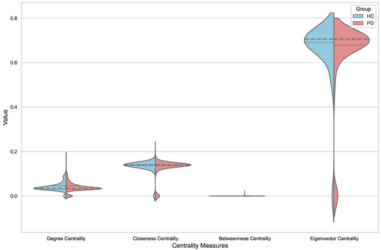 The analysis generated CD values, which were used to construct adjacency matrices representing the strength and directionality of connections between ROIs. From these matrices, key network metrics were extracted, including Degree Centrality, Closeness Centrality, Betweenness Centrality, and Eigenvector Centrality. Statistical analyses revealed significant differences between the HC and PD groups in specific network metrics. Notably, Closeness Centrality and Betweenness Centrality showed statistically significant reductions in the PD group ( after Bonferroni correction), indicating decreased efficiency in information spread and altered roles of critical intermediary nodes in PD patients.