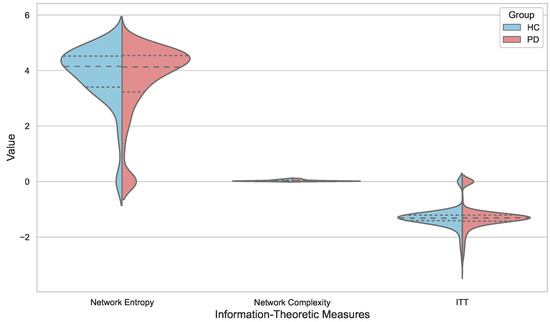 Information-theoretic measures—Network Entropy, Network Complexity, and IIT—were integrated into the analysis to assess the informational properties of the brain networks. The PD group exhibited higher Network Entropy values (mean entropy increased by 15% compared to HC), suggesting increased randomness and disrupted communication pathways. Correlation analyses further indicated that, in the HC group, strong positive correlations existed between centrality measures (e.g., r = 0.82 between Closeness Centrality and Eigenvector Centrality), reflecting a well-integrated network. In contrast, the PD group showed altered correlation patterns, including negative correlations between IIT and centrality measures (e.g., r = −0.65 between IIT and Degree Centrality), which highlight a shift in network organization and potential compensatory mechanisms.
