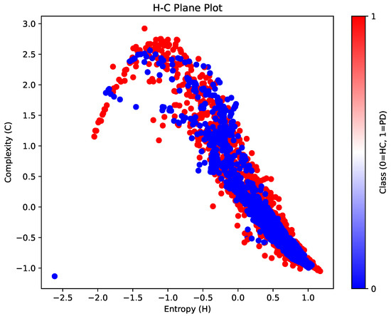 By plotting against , the H-C plane elucidates the balance between randomness and structured complexity within the brain network. Networks that lie toward higher entropy and complexity regions are indicative of intricate and adaptable connectivity patterns, while those positioned toward lower entropy and complexity suggest more rigid and less diverse interactions. In the context of Parkinson’s disease, shifts in the placement of brain networks on the H-C plane can reveal alterations in the balance between integration and segregation of neural processes, thereby shedding light on the disease’s impact on cognitive and motor functions.