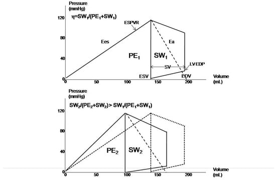 From the echocardiography-derived PV loops, MME can be described as the ratio between SW and the sum of PE and SW (Figure 2). This analysis appreciates the positive effects of LV reverse remodeling, including the benefit to survival, exerted either by drug or device therapies, mediated by the improvement in MEE, which must be considered a common denominator of the beneficial effects [22]. As is apparent from Figure 3, reverse remodeling not only improves MME but also exerts a favorable impact on ventricular–arterial coupling. Additionally, a close relationship between MME and ventricular–arterial coupling in patients with HFrEF was recently observed to demonstrate the importance of a proper balance between LV performance and load in optimizing myocardial function.