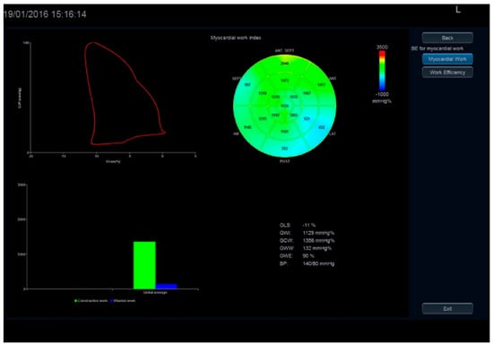 Pressure–strain loop (PSL) analysis is a novel noninvasive method for evaluating MW that combines information derived from strain imaging, assessed by speckle tracking echocardiography (STE) and systolic/diastolic blood pressure. It requires the assessment of the valvular opening and closure events that allow the determination of the isovolumic relaxation time and the ejection time. GMW is characterized by two distinct components: the global wasted work (GWW), that represents LV work that does not contribute to LV ejection, i.e., the internal work; and the global constructive work (GCW), that corresponds to the SW, that quantifies the energy consumed by the myocardium that effectively contributes to CO [20].