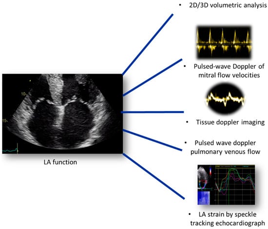 Echocardiography, in contrast, represents a simple, bedside and non-invasive tool that is useful for the assessment of LA function. Conventional parameters including volumetric analysis, pulsed-wave Doppler of mitral flow velocities, TDI and PVF, associated with STE analysis, are the main indices that allow accurate evaluation of LA pathophysiological changes that associate diastolic dysfunction and HF [52,53] (Figure 6).