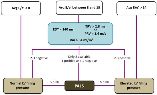 It is well known that LV filling pressure represents the afterload of LA contractile function; hence, when LV filling pressure is raised, the LA could be mechanically stressed and its function compromised. Raised LV filling pressure is reflected in reduced LA reservoir and pump function: many studies have shown that LA reservoir strain is associated with LV filling pressures and an LA reservoir strain < 18% predicts raised LV filling pressures better than LAVi [52]. Moreover, PALS has been shown to have excellent sensitivity and specificity in predicting a PCWP of ≥18 mmHg in patients with HF (PALS < 15.1% had the highest diagnostic accuracy) [60]. Based on this finding, PALS was integrated in the diagnostic algorithm for the evaluation of LV filling pressures by the European Association of Cardiovascular Imaging (EACVI). This algorithm includes mitral E wave associated with E/A ratio and additional criteria when E/A ratio is between 0.8 and 2.0. These criteria include average E/e′ > 14, peak TR velocity > 2.8 m/s and LAVi > 34 mL/m2. PALS < 18% is the third suitable parameter when one of the three other criteria is not available and the remaining two are conflicting.