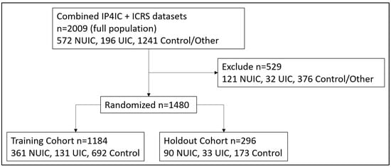 The CONSORT diagram in Figure 1 shows the flow of the combined dataset into the training and holdout cohorts for machine learning. Subjects were excluded from modeling if they met the conditions of any of the following categories: (i) subjects with suggested IC presence or symptoms but no formal diagnosis; (ii) prolonged exposure of the urine sample to heat at any point in the collection process; (iii) subjects with active urinary tract infections; (iv) subjects whose samples were collected in a clinic instead of via crowdsourcing; (v) subjects who were positive for SARS-CoV-2 within 6 months of sample collection; and (vi) subjects for which any of the modeling features was not present.