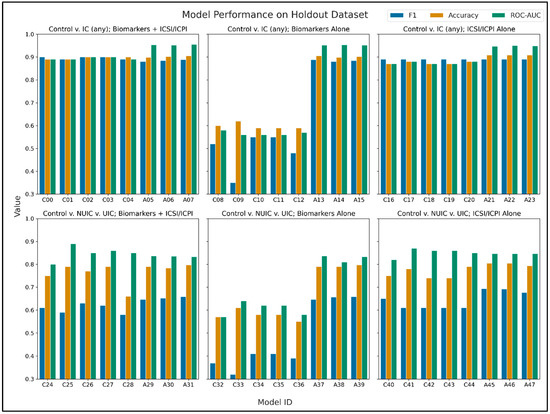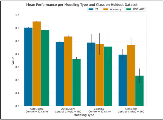 AutoGluon modeling takes a significantly different approach to modeling versus the classical ML methodology we have presented here and have used previously. The classical approach involves hyperparameter optimization on a single type of model, across different model types. AutoGluon, however, does not perform hyperparameter optimization by default but instead trains on a variety of different model types (many of which were not included in our classical approach), uses bootstrap aggregation, also known as bagging, when training the models, and performs a stack ensembling of the trained models that generally results in a better overall model with desirable predictive capacity [27]. This weighted ensemble of models tends to have increased predictive performance over simpler models. Additional model types that were not included in the classical modeling, such as XGBoost and neural networks, are included in the AutoGluon models, which affords greater flexibility during training and inference. All these benefits are likely contributors to the relatively large increase in F1, accuracy, and ROC-AUC for the “Biomarkers Alone” group over the classical modeling methods, as shown in Figure 4. The differences among other groups were not as significant, likely because the ICSI/ICPI scores provide relatively high predictive capacity alone. Although biomarkers alone yielded the lowest performance among the feature sets, they significantly enhanced classification accuracy when combined with ICSI/ICPI scores, providing a more objective basis for diagnosing IC.