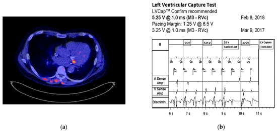 One of our cases, an adult patient with a 3-lead CRT-D, was programmed to left ventricular (LV)-only pacing mode due to an elevated threshold and non-capture of the right ventricular (RV) lead. The patient was admitted with spondylodiscitis in the context of Staphylococcus epidermidis bacteremia. Positron emission tomography-computed tomography (PET-CT) imaging revealed a localized uptake around the left coronary sulcus, indicative of LV lead infection (Figure 1a). This was further supported by device interrogation, which demonstrated an increased left ventricular (LV) lead pacing threshold of 5.25 V (Figure 1b). The patient was treated with vancomycin and rifampicin for CIED infection, and device extraction was performed. After 7 months, a new epicardial 3-lead CRT-D was implanted, and device interrogation indicated the restoration of RV and LV pacing thresholds (0.7 V and 1.4 V, respectively).