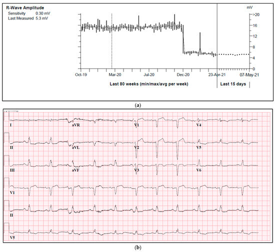 One of our cases was an adult patient with ischemic heart failure and a single lead ICD. During a routine check-up, a sudden drop in R-wave amplitude was observed in a true bipolar lead, with a reduction from 15 mV to 5 mV (Figure 2a). Both threshold and impedance remained stable. Further investigation revealed the presence of a new left anterior fascicular block on the ECG, which resulted in a change in the depolarization waveform and subsequently led to a decrease in R-wave amplitude (Figure 2b,c).