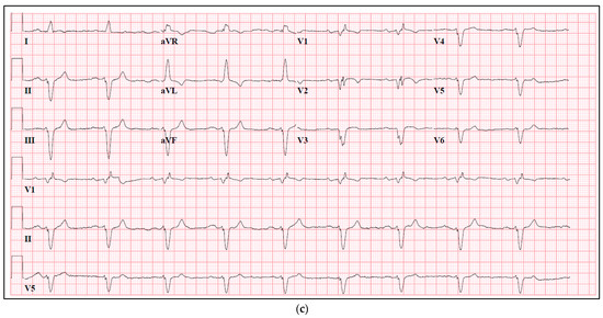 (a) A sudden drop in R-wave amplitude caused by new onset left anterior fascicular block. (b) ECG prior to a drop in R-wave amplitude. (c) ECG after a drop in R-wave amplitude.