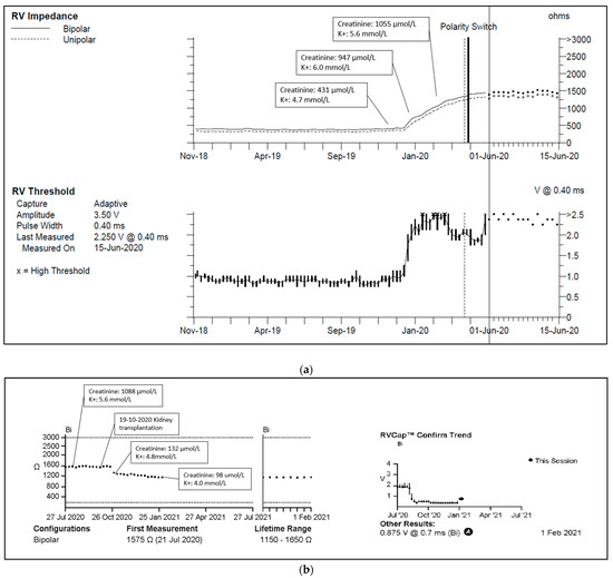 One of our cases, an adult patient with a history of kidney failure and a 3-lead CRT-P. As kidney function deteriorated, plasma creatinine concentrations increased to 854–1156 μmol/L (reference value 50–90 μmol/L), and plasma potassium concentrations often exceeded 5.2 mmol/L (reference value 3.5–5.0 mmol/L). Concurrently, RV lead pacing impedance rose from 399 to 1330 Ohms, and the pacing threshold increased from 0.625 V to 2.00 V, with unchanged sensitivity (Figure 3a,b). Following a kidney transplant one year later, kidney function and plasma potassium concentrations normalized, leading to reduced pacing impedance and normalized pacing thresholds.
