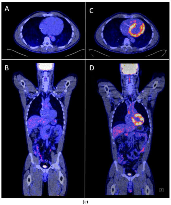 One of our cases was an adult patient with third-degree AV block caused by cardiac sarcoidosis, for which he had received a 2-lead ICD programmed in DDI-40 (dual-chamber pacing and sensing with inhibition, pacing both the atrium and ventricle, with a lower rate of 40 bpm). Over a period of seven years, remission was sustained, supported by 0% atrial or ventricular pacing and the absence of rhythm abnormalities. Subsequently, the patient presented with palpitations identified as recurrent AV block, leading to 100% ventricular pacing (Figure 5a,b). PET-CT imaging revealed a high suspicion of reactivation of cardiac sarcoidosis, with increased uptake of F-18 fluorodeoxyglucose (FDG) observed in the left ventricle, septum, and right ventricular free wall (Figure 5c). Following treatment with prednisone, remission was achieved, and the percentage pacing returned to 0%.