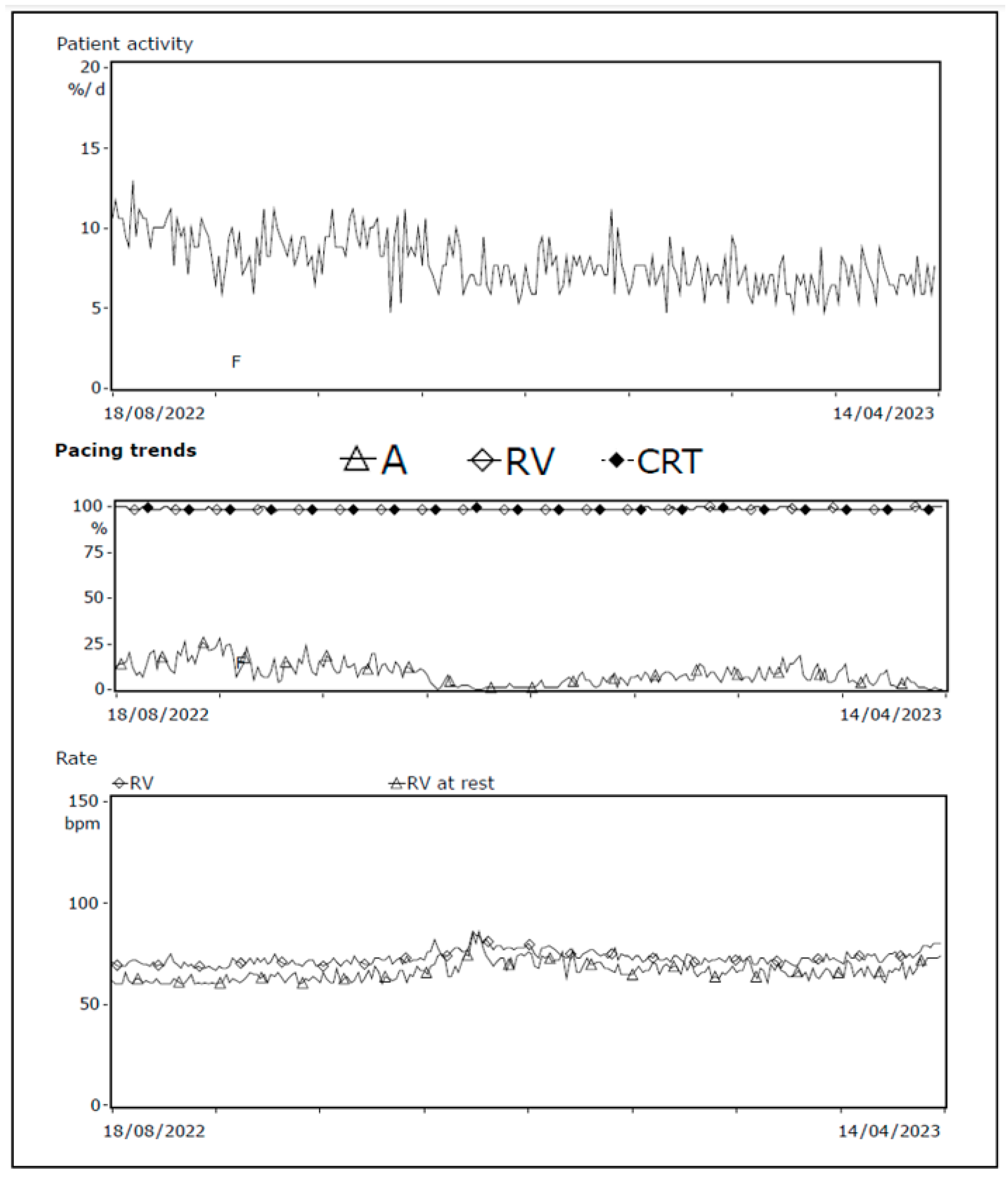 One of our cases, an adult patient with a history of ischemic heart failure and CRT-D, reported dyspnea upon exertion and fatigue during routine device checkup. Device interrogation showed no changes in impedance, threshold, or sensitivity, and biventricular pacing remained stable at 99%. However, it did reveal a decline in patient activity percentage, reduced atrial pacing (indicating higher intrinsic sinus node frequency), and a slightly elevated resting heart rate (Figure 6). During the visit, the patient appeared pale, prompting blood testing that revealed severe anemia (Hb 2.8 mmol/L, reference value 8.5–11.0 mmol/L). Further evaluation confirmed acute myeloid leukemia, and the patient underwent indicated treatment.