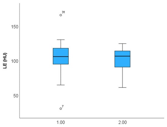 Statistical analysis was performed using SPSS™ software (V25.0, SPSS Inc., Chicago, IL, USA). Quantitative variables are expressed as means ± standard deviation (SD) and categorical variables as absolute values and percentages. Chi-square and Fisher’s exact tests were applied to test for differences in categorical data (the prevalence of LE in groups of patients with ≥2 mm and ≥1.5 mm LAWT cut-offs). Pearson’s correlation coefficient was calculated to define the correlation between LAWT and LE density (HU). The independent t-test was applied to test for differences in the CT density (HU) of LE and artifacts. Interobserver and intraobserver variability (reliability) was defined by the weighted Cohen’s Kappa, and additionally, for parametric data (mean LAWT), Pearson’s correlation coefficient was calculated, and Bland–Altman plots were generated.