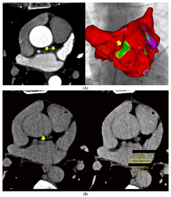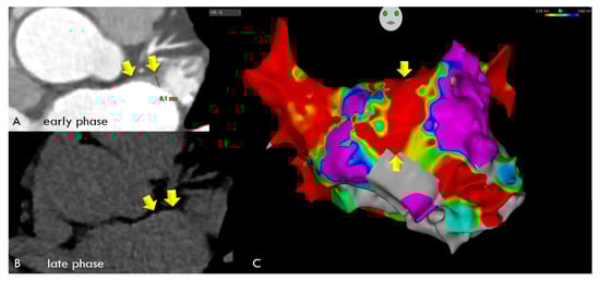A 59-year-old male with a BMI of 27.8 kg/m2, and a LVEF of 68% with paroxysmal AFIB and severe left atrial wall thickening (LAWT) with a maximum of 5.1 mm during early-phase CT (Panel (A), arrows) and linear late enhancement during late-phase CT (Panel (B), arrows), indicating diffuse fibrosis, which was correlated with low-voltage areas along the entire anterior left atrial wall during electroanatomical mapping (EAM). (Panel (C)) All 20 spots were positive for low-voltage areas of <0.5 mV, shown as red areas (yellow arrows), with values ranging from 0.015 to 0.12 (mean: 0.024 mV). While LA ablation with pulmonary vein isolation was successful, the patient experienced recurrent AFIB after 3 months, and a second LA ablation was performed 7 months later.