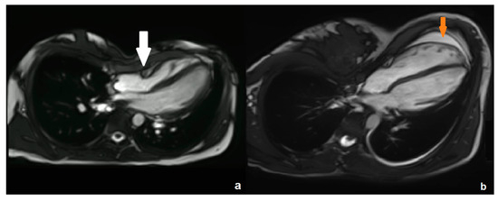 An example of a steady-state free-precession cardiac MRI sequence demonstrates the most frequent type of compression of the RV base by the sternum ((a), white arrow). In a second example (b), a shift of the entire heart to the left is depicted in addition to a pericardial effusion (orange arrow).