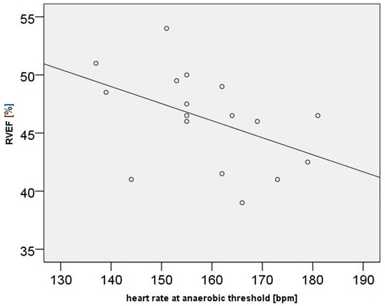 LV ejection fraction correlated negatively with VO2max (rho = −0.63, p = 0.007), O2-pulsemax% (rho = −0.52, p = 0.034), and Wattmax (rho = −0.51, p = 0.035). RV ejection fraction correlated negatively with HRAT (rho = −0.54, p = 0.024, Figure 2).
