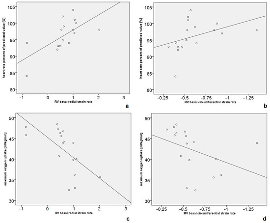 We did not find significant correlations between RV longitudinal strain rate and any of the CPET parameters. Correlations between RV radial and circumferential strain rates and CPET data are shown in Supplementary Table S2. Positive correlations between RV basal radial strain rates and HRmax (rho = 0.71, p = 0.002), as well as HRmax% (rho = 0.72, p = 0.001, Figure 3a), were demonstrated. Circumferential strain rates corresponded to the aforementioned values (HRmax: rho = −0.53, p = 0.028; HRmax%: rho = 0.72, p = 0.001, Figure 3b). In addition, RV basal radial strain rate correlated negatively with VO2max (rho = −0.8, p < 0.001, Figure 3c), with a corresponding positive correlation for circumferential strain rate (rho = 0.73, p = 0.001, Figure 3d).
