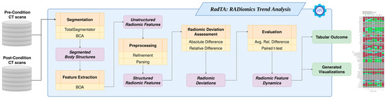 Background/Objectives: The integration of machine learning into the domain of radiomics has revolutionized the approach to personalized medicine, particularly in oncology. Our research presents RadTA (RADiomics Trend Analysis), a novel framework developed to facilitate the automatic analysis of quantitative imaging biomarkers (QIBs) from time-series CT volumes. Methods: RadTA is designed to bridge a technical gap for medical experts and enable sophisticated radiomic analyses without deep learning expertise. The core of RadTA includes an automated command line interface, streamlined image segmentation, comprehensive feature extraction, and robust evaluation mechanisms. RadTA utilizes advanced segmentation models, specifically TotalSegmentator and Body Composition Analysis (BCA), to accurately delineate anatomical structures from CT scans. These models enable the extraction of a wide variety of radiomic features, which are subsequently processed and compared to assess health dynamics across timely corresponding CT series. Results: The effectiveness of RadTA was tested using the HNSCC-3DCT-RT dataset, which includes CT scans from oncological patients undergoing radiation therapy. The results demonstrate significant changes in tissue composition and provide insights into the physical effects of the treatment. Conclusions: RadTA demonstrates a step of clinical adoption in the field of radiomics, offering a user-friendly, robust, and effective tool for the analysis of patient health dynamics. It can potentially also be used for other medical specialties.