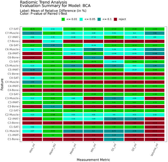 A generated overview visualization for the HNSCC-3DCT-RT dataset produced by RadTa, presenting each evaluated radiomic feature in the cervical spinal cord, its average relative difference, and its deviation significance as color. This is measured by applying a paired t-test between pre- and post-treatment radiomic feature scores computed.