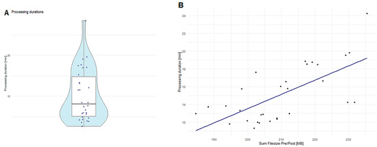 Processing duration analysis results. (A): The distribution of processing duration in minutes for the HNSCC-3DCT-RT. (B): The relationship between processing time in minutes and file size represented through the file size sum of pre- and post-therapy volumes for the HNSCC-3DCT-RT.