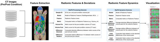 As refinement is a crucial step in a radiomic analysis pipeline, RadTA focuses on the inclusion of the only pairwise-existing features present in both pre- and post-condition scans per patient. Non-pairwise-existent features are automatically excluded from further analyses for the corresponding patient. Furthermore, to ensure compatibility and allow the utilization of radiomic features from both segmentation modules, a restructuring process of the radiomic feature table is conducted. The restructuring involves parsing the data into a universal tabular data format that can be expressed in common formats such as CSV, enabling manual insights by users interested in reviewing or analyzing the patient individual radiomic feature tables. This process streamlines the data structure and provides accessible radiomic feature tables for each patient.