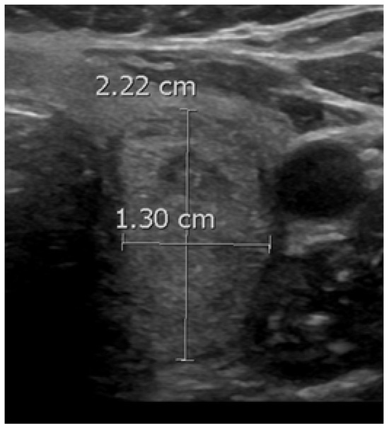When a thyroid nodule has an anteroposterior (AP) dimension that exceeds its transverse (TR) dimension such that the ratio is greater than 1, it is classified as having a taller-than-wide shape (Figure 3). This observation was first reported in 2002 by Kim et al. in a study involving 155 thyroid nodules with an average size of 7.5 mm, of which 49 were malignant. This study found that a taller-than-wide shape was associated with a 92.5% specificity and 32.7% sensitivity for malignancy [51]. The authors proposed that this taller-than-wide configuration may reflect an underlying tendency for malignant nodules to grow across tissue planes, unlike benign nodules, that grow along tissue planes [51]. A meta-analysis and a systematic review by Brito et al., examining 31 studies and 18,288 nodules with an average size of 1.5 cm, reported that a taller-than-wide shape was associated with an OR of 11.1 (95% CI, 6.6 to 18.9) for malignancy [52]. In our study, we observed a significant association between a taller-than-wide shape and malignancy for nodules <1 cm but not for those above this size. For nodules <1 cm, a taller-than-wide shape was observed in 66.7% of malignant nodules compared to 5% of benign nodules (p = 0.03). In comparison, for nodules ≥1 cm, a taller-than-wide shape was seen in 14.6% of malignant nodules versus 13% of benign nodules (p = 0.67). Other studies have found similar findings [53,54]. In a study involving 207 nodules, of which 110 were malignant, Ren et al. found that a taller-than-wide shape was a good predictor for papillary cancer for nodules ≤1 cm but not for larger nodules [53]. In a study involving 1238 nodules, of which 159 were papillary cancers, Kim et al. found that a taller-than-wide shape was associated with an OR for cancer of 2.7 (95% CI, 1.7 to 4.3) (p < 0.001) for nodules ≤1 cm vs. an OR of 1.2 (95% CI, 0.4 to 3.2) (p = 0.77) for nodules >1 cm [54].