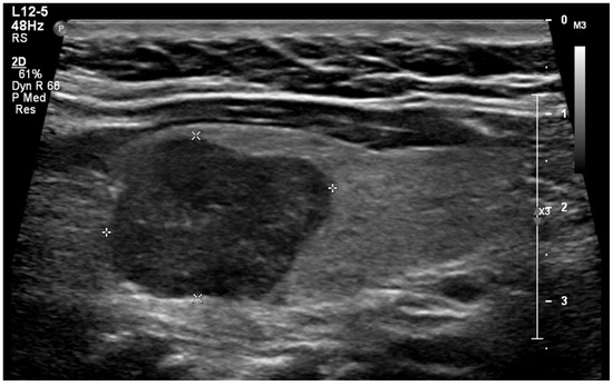 Thyroid nodules that exhibit lower echogenicity than the adjacent neck muscles are described as having a very hypoechoic or markedly hypoechoic appearance (Figure 4) [6,15,24]. Our study found a very hypoechoic appearance in 9.4% of malignant nodules compared to 0.6% of benign nodules. This characteristic was significantly associated with malignancy, yielding an OR of 13.3 (95% CI, 3.8 to 45.9), at p < 0.001. In a study involving 2255 nodules, of which 293 were malignant, Lee et al. discovered that for homogenously solid nodules, a marked hypoechoic or moderate hypoechoic appearance was associated with a significantly higher cancer risk (51.9 to 59.2% vs. 21.3%) compared to a mildly hypoechoic appearance (p < 0.001) [55]. In a multi-institution study involving 5601 nodules, of which 1089 were malignant, Lee et al. observed a malignancy risk of 64.8% in markedly hypoechoic nodules, 48.2% in moderately hypoechoic nodules, 23.5% in mildly hypoechoic nodules, and 8.7% in iso- or hyperechoic nodules (p < 0.001) [56]. Kim et al. examined the relationship between the histologic findings and nodule echogenicity, observing a trend of increasing fibrosis as the nodule echogenicity decreased [57]. These study findings may help explain the tendency for markedly hypoechoic nodules to be malignant, as fibrosis is an underlying feature in papillary cancer [57].