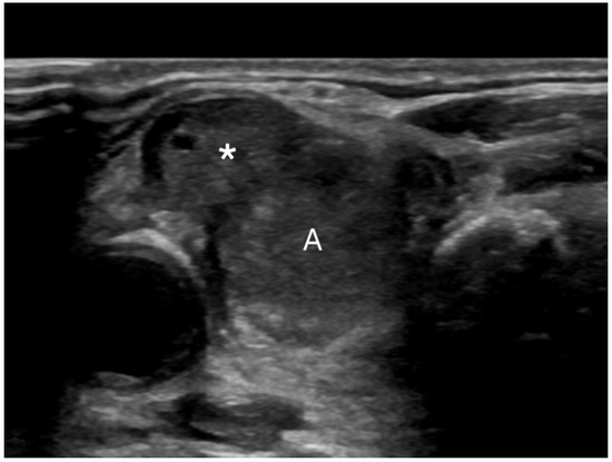 Extrathyroidal extension (*) extending anteriorly from a malignant nodule (A).