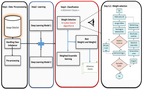 Artificial intelligence (AI) [1] and machine learning are emerging as powerful tools in the fight against Alzheimer’s disease [2,3]. By training models to recognize patterns in brain images or other biomarkers [4], these technologies hold the promise of automating the diagnosis process, potentially making it faster and more accurate. In particular, deep learning models [5,6,7,8], like convolutional neural networks (CNNs), have shown great promise in analyzing medical images to detect disease patterns. However, these models have limitations: they often require vast amounts of data and computational power, and they can sometimes struggle to generalize across different patient populations or datasets. This is where combining multiple models, an approach known as ensemble learning, can come into play.