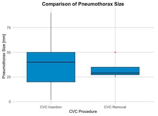 To assess the effect of CVC removal on pneumothorax size, a linear regression model was used. The logistic model examined the relationship between pneumothorax size and whether the CVC was removed. The intercept (37.139) suggests an average pneumothorax size of 37 mm when CVC removal is not considered. CVC removal had a non-significant effect, with a coefficient of −3.889, indicating a slight reduction in size (p = 0.713).