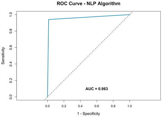 The performance of the NLP algorithm was further evaluated using a receiver operating characteristic (ROC) curve. The area under the curve (AUC) was calculated to be 0.9283, reflecting the algorithm’s strong ability to distinguish between pneumothorax-positive and pneumothorax-negative cases (Figure 2).