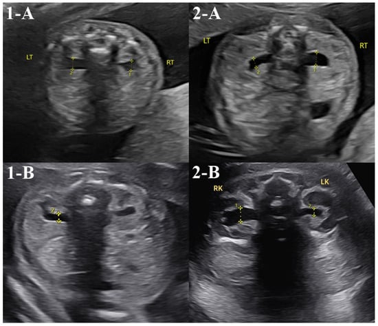 Abnormal prenatal detailed ultrasound cases. Asterisk means anteroposterior renal pelvic diameter. In the second-trimester detailed ultrasound, two cases exhibited abnormal findings. Case 1 showed mild bilateral renal pelvis dilation on the detailed ultrasound performed at 22 weeks (1-A, anteroposterior renal pelvic diameter left 4.0mm, right 4.5 mm). However, follow-up examinations at 24 weeks confirmed normal findings bilaterally (1-B). Case 2 demonstrated mild right renal pelvis dilation on the detailed ultrasound performed at 21 weeks (2-A, anteroposterior renal pelvic diameter right 4.3 mm), and the same findings were noted on another detailed ultrasound at 36 weeks (2-B, anteroposterior renal pelvic diameter right 8.0 mm). However, postnatal examination confirmed normal findings bilaterally in the newborn.