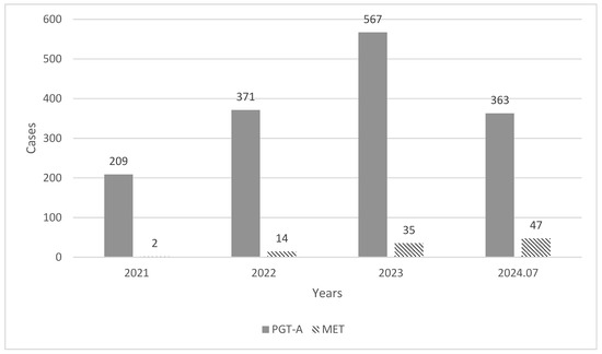 Annual trend in PGT-A and MET cases in our center. PGT-A preimplantation genetic testing for aneuploidy; MET mosaic embryo transfer. The figure shows a significant upward trend in the number of PGT-A (solid bars) and MET (striped bars) cases from 2021 to 2024. PGT-A cases increased from 209 in 2021 to 363 by July 2024, more than tripling. Similarly, MET cases rose sharply from 2 in 2021 to 47 by 2024, indicating a more than 40-fold increase.