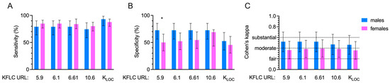 The ability of different indices of free kappa light chains (KFLC) to identify the diagnosis of multiple sclerosis was assessed. Sensitivity (A), specificity (B), and agreement (C) were evaluated for each parameter in the sex-disaggregated population. Abbreviations: URL—Uniform Resource Locator; fair agreement—range from 0.21 to 0.40; moderate agreement—range from 0.41 to 0.60; substantial agreement—range from 0.61 to 0.80. Fisher’s exact test was used to compared sensibility and specificity between males and females. *: p = 0.0451.