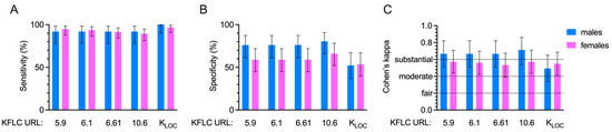Specificities showed values ranging between 52.17% (KLOC) and 80.43% (K Index > 10.61) among males and from 53.57% (KLOC) to 66.07% (K Index > 10.61) among females, with no significant differences between the two sexes (Figure 2, panel B).