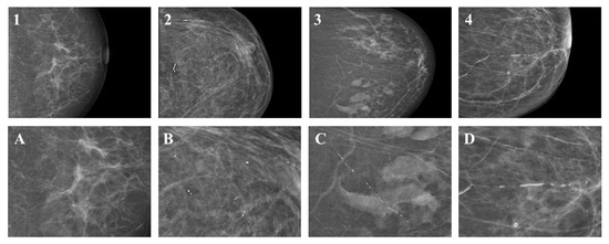 Microcalcifications were defined according to the fifth edition of the Breast Imaging Reporting and Data System (BI-RADS) [22]. As recommended, grouped microcalcifications were defined as at least five calcifications within 1 cm3 [22]. BAC, in general, was defined as linear tubular calcifications clearly associated with blood vessels [22]. Based on clinical analogy to the BI-RADS catalogue, four grades were established for microcalcifications and findings, possibly caused by breast artery calcifications (Figure 1): BAC Grade 1 consisted of patients without visible or sporadic scattered microcalcifications. BAC Grade 2 was defined as a few discontinuous calcified particles visible in a single location and with questionable association with a tubular structure mimicking fibroglandular microcalcifications. Calcifications clearly originating from BAC but of a modest degree were classified as BAC Grade 3, whereas BAC Grade 4 was defined as substantial BAC. All mammographies were read independently by three different readers (J.A.S., 3 years of experience; E.M., 10 years of experience; A.B., 20 years of experience). Each patient was assigned a grade if there were no visible microcalcifications, or if microcalcifications or BAC were detected in the right breast, the left breast, or both breast projections. Each reader gave the higher grade if the proposed grade differed between the right or left projections. For further evaluations in case of disagreement between readers, the majority of readers’ assigned scores were utilized. A consensus score was established through discussion if no majority was reached due to the divergence of the scores proposed by all readers.