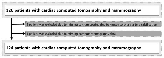 A total of 126 patients, having received both cardiac CT and mammography, which were available on our institutional PACS system, were included. Two patients had to be excluded, one because of missing calcium scoring due to known CAC and the other due to missing CT data (Figure 2). An overview of the patient characteristics is provided in Table 1. The median age was 57 years (IQR 15), with a significant difference between the VCs group with 62 years (IQR 12) and the no BAC group with 52 years (IQR 14). The median time difference between mammography and cardiac CT was 2.94 (IQR 17) years, with no significant difference between the two groups. Mammography of both breasts was available in 119 cases, whereas in 5 cases, due to ablation of the contralateral side, unilateral mammography was performed.