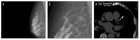 Breast cancer screening aims to detect a malignancy at an earlier stage compared to clinical findings to reduce mortality and to improve treatment options, allowing for a high number of patients undergoing breast-conserving therapy instead of mastectomy [8,9]. An proportion of 0–40% of breast cancers exhibit microcalcifications [10]. Microcalcifications (MC) are responsible for detecting 85–95% of cases of ductal carcinoma in situ (DCIS) on mammography screening [11,12]. MC are small calcium compounds with a size of 50–150 µm, typically calcium oxalate or calcium phosphate [13,14]. While calcium oxalate compounds are usually benign, calcium phosphate is associated with breast cancer [13]. The BI-RADS fifth edition lexicon considers ‘amorphous’, ‘coarse heterogeneous’, ‘fine pleomorphic’, and ‘fine linear or fine-linear branching’ as typically suspicious calcification morphologies [15]. Common secondary findings in mammograms are called Mönckeberg calcifications, which are breast arterial calcifications (BAC) involving the middle layer of the mammary arteries [16]. Previous studies have suggested that BAC seen on mammography may be correlated with coronary artery calcification (CAC), which is highly prevalent in patients with CHD [17,18,19,20].