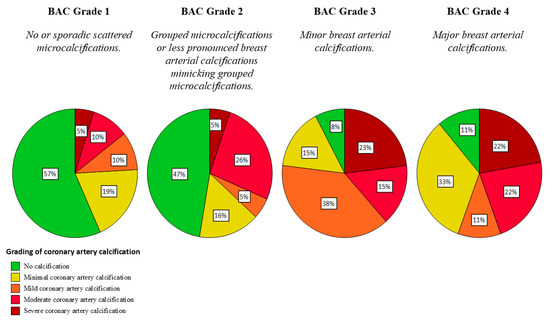 Objective: This study develops a BI-RADS-like scoring system for vascular microcalcifications in mammographies, correlating breast arterial calcification (BAC) in a mammography with coronary artery calcification (CAC), and specifying differences between microcalcifications caused by BAC and microcalcifications potentially associated with malignant disease. Materials and Methods: This retrospective single-center cohort study evaluated 124 consecutive female patients (with a median age of 57 years). The presence of CAC was evaluated based on the Agatston score obtained from non-enhanced coronary computed tomography, and the calcifications detected in the mammography were graded on a four-point Likert scale, with the following criteria: (1) no visible or sporadically scattered microcalcifications, (2) suspicious microcalcification not distinguishable from breast arterial calcification, (3) minor breast artery calcifications, and (4) major breast artery calcifications. Inter-rater agreement was assessed in three readers using the Fleiss’ kappa, and the correlation between CAC and BAC was evaluated using the Spearman’s rank-order and by the calculation of sensitivity/specificity. Results: The reliability of the visual classification of BAC was high, with an overall Fleiss’ kappa for inter-rater agreement of 0.76 (ranging between 0.62 and 0.89 depending on the score). In 15.1% of patients, a BAC score of two was assigned indicating calcifications indistinguishable regarding vascular or malignant origin. In 17.7% of patients, minor or major breast artery calcifications were found (BAC 3–4). BAC was more prevalent among the patients with CAC (p < 0.001), and the severity of CAC increased with the BAC score; in the group with a BAC score of one, 15% of patients exhibited mild and severe CAC, in those with a BAC of two, this was 31%, in those with BAC of three, this was 38%, and in those with a BAC of four, this was 44%. The sensitivity for detecting CAC, based on the mammographic BAC score, was 30.3% at a specificity of 96.7%. Conclusions: The standardized visual grading of BAC in mammographies on a four-point scale is feasible with substantial interobserver agreement, potentially improving the treatment of patients with suspicious microcalcifications and CAC.