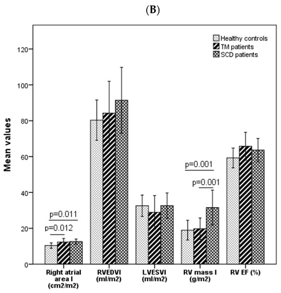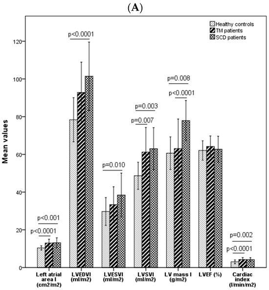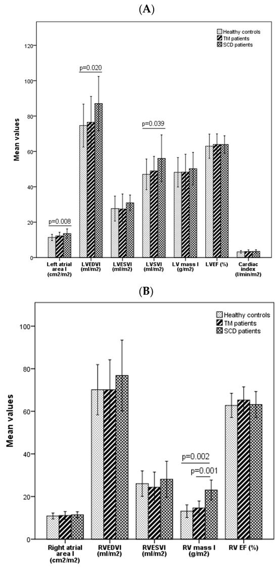 Firstly, we observed that males had higher biventricular volumes and mass indexes than females in all three groups. Gender-based differences in cardiac volumes and mass are well-established and routinely considered in clinical practice. Our finding is in agreement with previous studies on normal subjects [50,51] and TM [35] and SCD patients [38]. For this reason, we conducted a separate analysis for males and females.