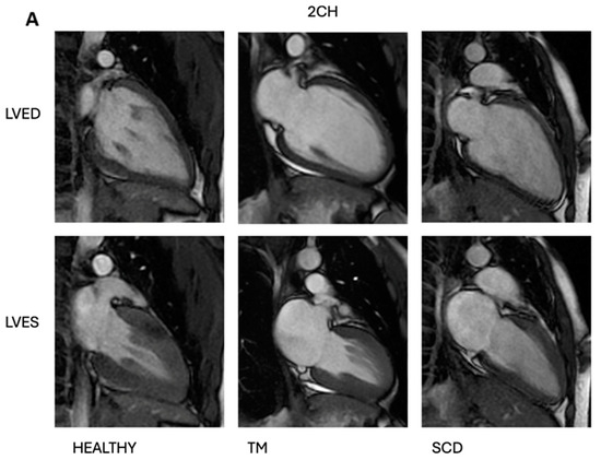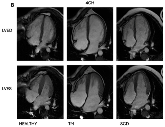 Three males, 18 years old (two-chamber view (A) and four-chamber view (B). Healthy subject: LVED volume index = 69 mL/m2, LVES volume index = 26 mL/m2; TM patient: LVED volume index = 88 mL/m2, LVES volume index = 38 mL/m2; SCD patient: LVED volume index = 139 mL/m2, LVES volume index = 64 mL/m2. LVED = left ventricular end diastole; LVES = left ventricular end systole; TM = thalassemia major; SCD = sickle cell disease; CH = chamber.