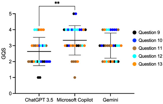 The score of the AI responses regarding dental abnormalities. The Kruskal–Wallis test was used for comparisons, ** p < 0.01. Bars indicate the mean and SD.