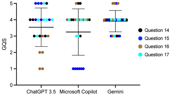 The answers in Japanese from the generative AI tools were evaluated by six evaluators, all of whom were pediatric dentists with >5 years of clinical experience in pediatric dentistry at a university hospital, according to a previous study [21]. The evaluation criteria were the Global Quality Scale (GQS) as used in previous studies (Table 2) [10,43]. The scores were rated from 1 to 5, with 1 being the lowest and 5 being the highest. The AI response score for each question was determined by calculating the mean and standard deviation of the scores by the six evaluators.