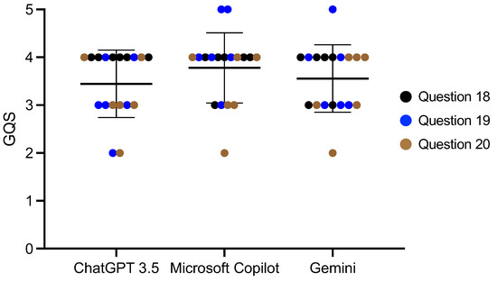 The scores of the AI responses to the 20 questions are shown in Table 3. The scores of each AI ranged from 1.00 ± 0.00 to 4.50 ± 0.55. The average of the AI scores for each question ranged from 2.61 ± 1.04 to 3.83 ± 0.71; the total average score was 3.34 ± 0.94. For the lowest AI score of 1.00, the generative AI misread the systemic disease.