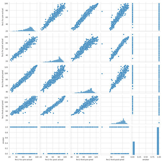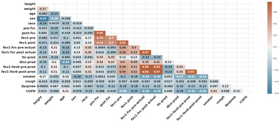 The dataset used for this research was collected after receiving a waiver from the institutional review committee of Pulmonary Associates of Corpus Christi [28]. A retrospective chart review was conducted on all patients sequentially undergoing pulmonary function tests (PFTs) in a community pulmonary clinician’s office from January 2000 to June 2022. The study utilized the MGC Diagnostic product, which focuses on the Ultima PFTM pulmonary function system (i.e., the MGC Diagnostics company based at 350 Oak Grove Parkway, St. Paul, MN, USA). The patients were referred for a pulmonary function test secondary to shortness of breath, possible COPD, asthma, reactive lung disease, or pre-operative clearance. The demographic dataset and pulmonary function dataset, retrieved from the Electronic Medical Records (EMRs), included demographic variables such as height, weight, age, sex, and race, as well as clinical information such as history of smoking, cough, dyspnea, and clinical COPD. The utilized dataset consists of 19 features, as shown in Figure 3.