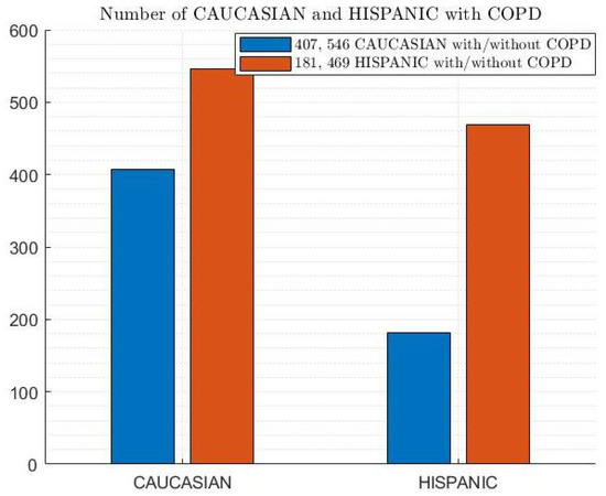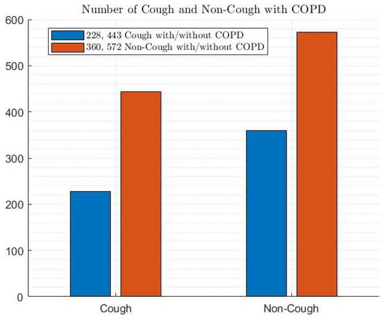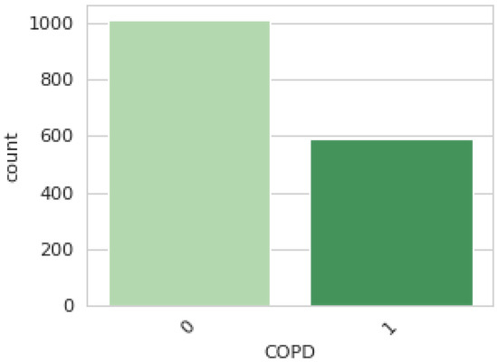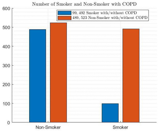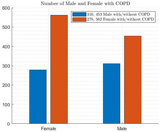Figure 5 shows the dataset with a gender distribution of 47.6% male (i.e., 310 and 453 males with and without COPD, respectively) and 52.4% female (i.e., 278 and 562 females with and without COPD, respectively).