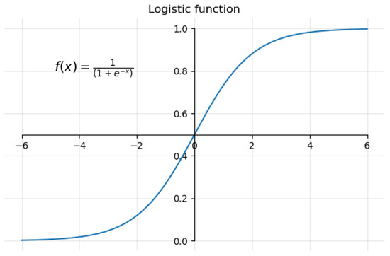 One kind of regression analysis proposed and utilized well for binary classification is logistic regression (LR) [33,34]. Recently, it has been used in several medical applications [35]. LR utilizes predictive models to build a relationship between a dependent variable (i.e., model output) and one or more independent variables (i.e., features) by finding the best-fit logistic function (), as shown in Figure 9.