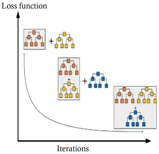 As an ensemble machine learning approach, the gradient boosting classifier (GBC) combines many weak models into one more robust model, increasing the prediction power of the combined model. GBC is an efficient techniques applicable to both classification [38] and regression problems. It operates iteratively by training decision trees on the residuals of the preceding tree, utilizing gradient descent optimization to minimize the loss function as shown in Figure 11. This technique enables the algorithm to learn more intricate decision boundaries, improving prediction accuracy.