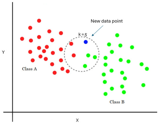 The number of neighbors to consider is represented by the “K” in KNN. The algorithm determines the distance between the unlabeled data point and all the labeled data points in the training set to make a prediction. Equation (7) can be used to calculate the Euclidean distance () between two sets of data (X and Y, where , , and n represents the features).